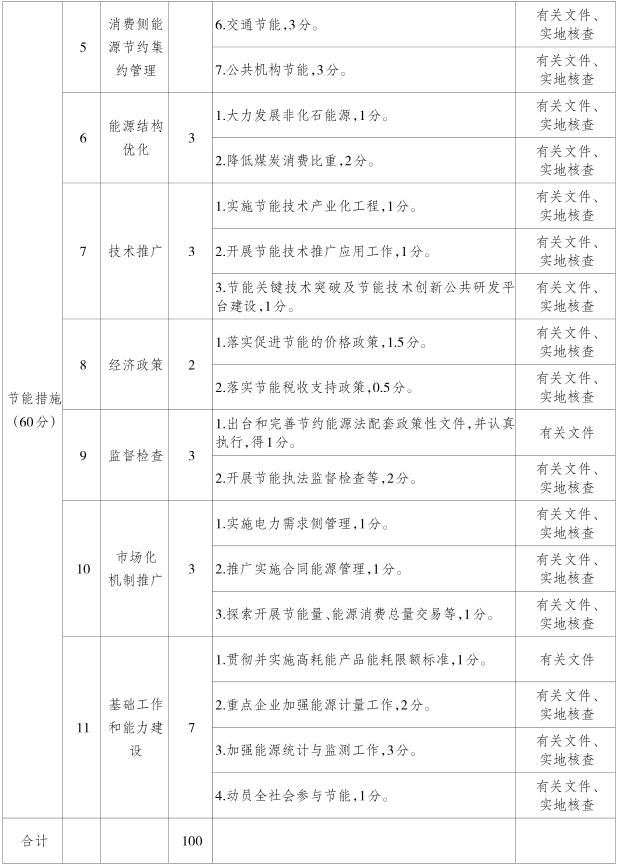 2.節(jié)能措施落實(shí)情況指標(biāo)為定性考核指標(biāo),滿分為60分。主要包括目標(biāo)責(zé)任、結(jié)構(gòu)調(diào)整、重點(diǎn)工程、消費(fèi)側(cè)能源節(jié)約集約管理、能源結(jié)構(gòu)優(yōu)化、技術(shù)推廣、經(jīng)濟(jì)政策、監(jiān)督檢查、市場(chǎng)化機(jī)制推廣、基礎(chǔ)工作和能力建設(shè)等10個(gè)方面內(nèi)容。