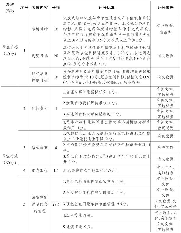 1.節(jié)能目標(biāo)完成情況為定量考核指標(biāo),滿分為40分。以市政府確定的各縣(市、區(qū))萬元地區(qū)生產(chǎn)總值能耗降低年度和進(jìn)度目標(biāo)、能耗增量控制目標(biāo)為基準(zhǔn),依據(jù)市統(tǒng)計(jì)局核定的年度指標(biāo)完成情況進(jìn)行評(píng)分。