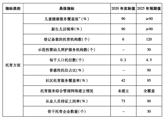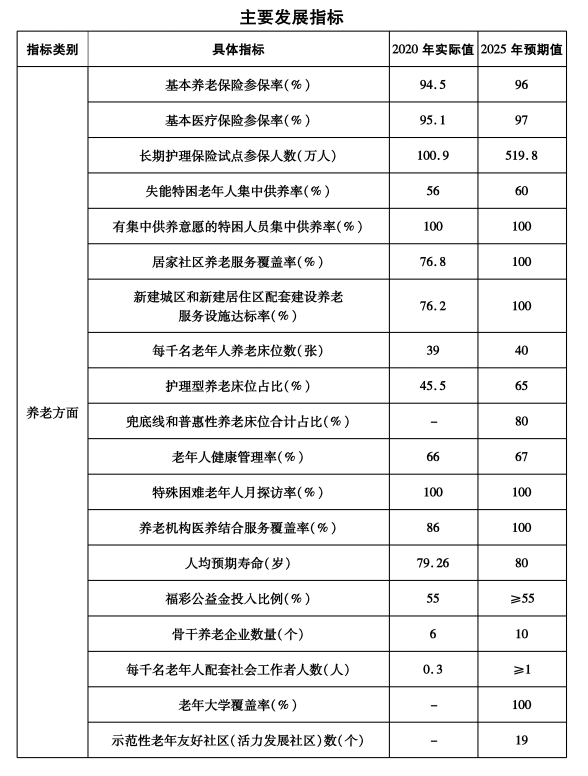 ?。ㄒ唬┲饕繕恕5健笆奈濉蹦?,全市新增養老床位10000張、托位8000個。以居家為基礎、社區為依托、機構為支撐的多方參與、功能齊全、布局合理、監管到位的養老托育服務體系更加完善,政策體系更加健全,服務能力不斷增強,養老托育事業和產業蓬勃發展,老年宜居、兒童友好的環境初步形成。城鄉養老服務設施覆蓋率明顯提升,縣(市、區)、鄉鎮(街道)、村(社區)、家庭四級養老服務網絡基本形成,長期護理保險制度更加完善,普惠養老、互助養老全面發展,家庭養老支持措施進一步強化;市縣兩級托育示范指導中心建設完成,托育服務機構加快擴容,家庭嬰幼兒照護服務有序推進,嬰幼兒照護服務管理體制機制初步建立;政府監管、行業自律、社會監督相結合的養老托育服務綜合監管制度更加完善,養老托育服務與文化、教育、家政、醫療、旅游、制造等行業融合發展,形成一批特色鮮明、競爭力強的龍頭企業、服務品牌和產業集群。