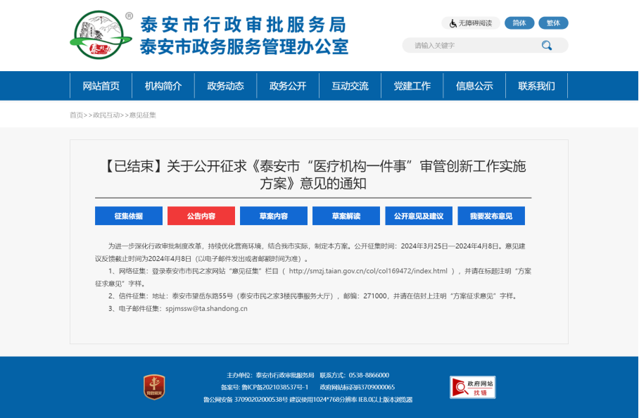 泰安市從醫療機構實際需求出發,積極發揮政務公開促改革、優服務的重要作用,在全省率先實現“醫療機構一件事”集成審批,通過進一步優化流程、加強政策解讀、降低辦理成本,助推“高效辦成一件事”落地實施。