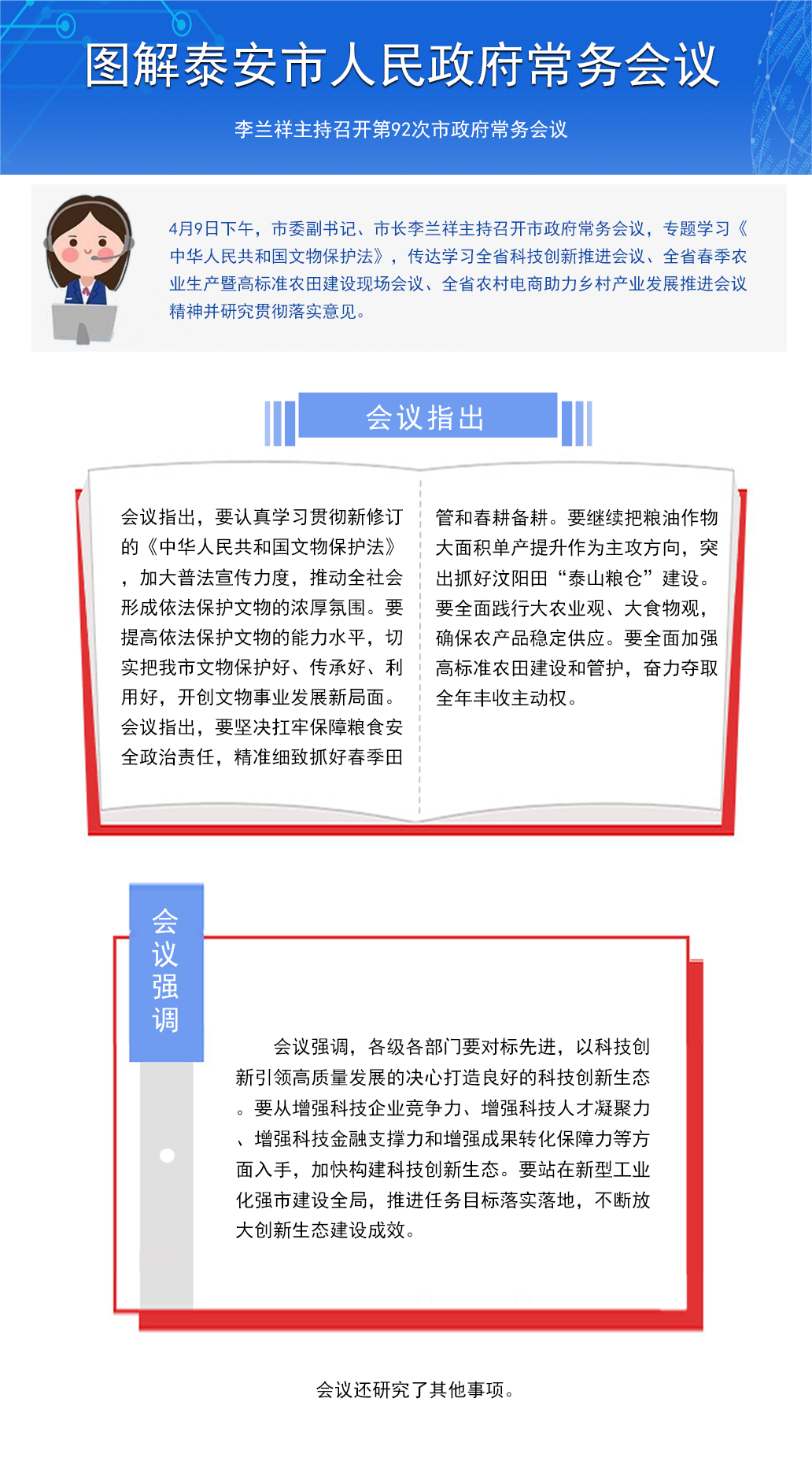 會議議題:專題學習《中華人民共和國文物保護法》,傳達學習全省科技創新推進會議、全省春季農業生產暨高標準農田建設現場會議、全省農村電商助力鄉村產業發展推進會議精神并研究貫徹落實意見。