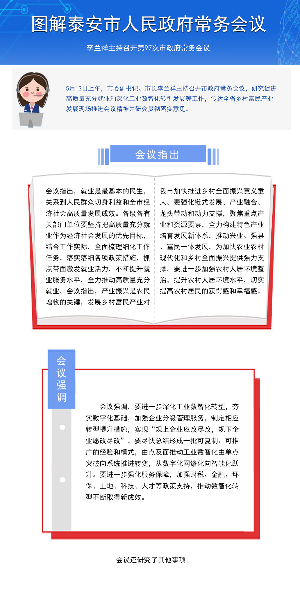 5月13日上午,市委副書記、市長李蘭祥主持召開市政府常務會議,研究促進高質量充分就業和深化工業數智化轉型發展等工作,傳達全省鄉村富民產業發展現場推進會議精神并研究貫徹落實意見。