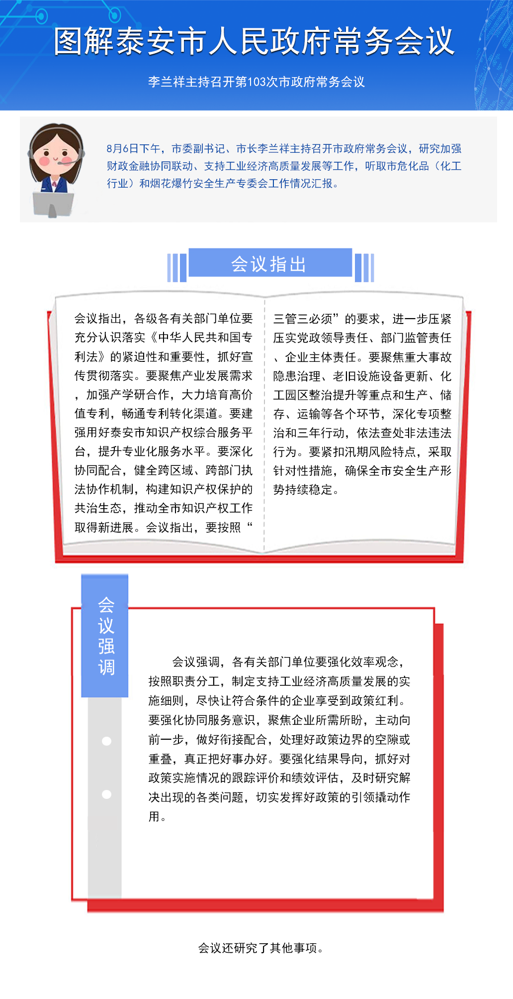 8月6日下午,市委副書記、市長李蘭祥主持召開市政府常務會議,研究加強財政金融協同聯動、支持工業經濟高質量發展等工作,聽取市?;罚ɑば袠I)和煙花爆竹安全生產專委會工作情況匯報。